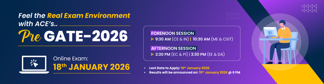 ACE Pre-GATE 2026 is an All India Computer-based Mock Test. Pre-GATE will be a replica of main GATE 2026 conducted by IIT Guwahati. It is conducted for the engineering streams-EC,EE,CE,ME,CS,IN,PI & DA.
